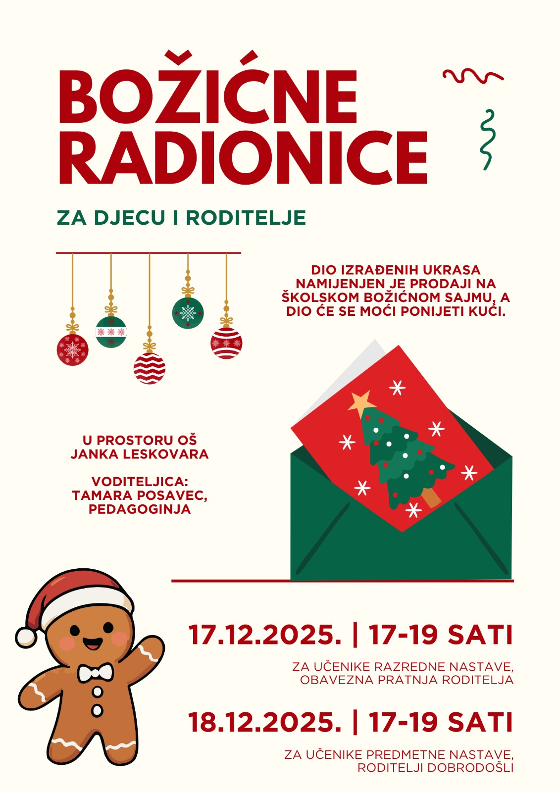SRIJEDA 17.12. - radionica za učenike nižih razreda uz OBAVEZNU pratnju roditelja